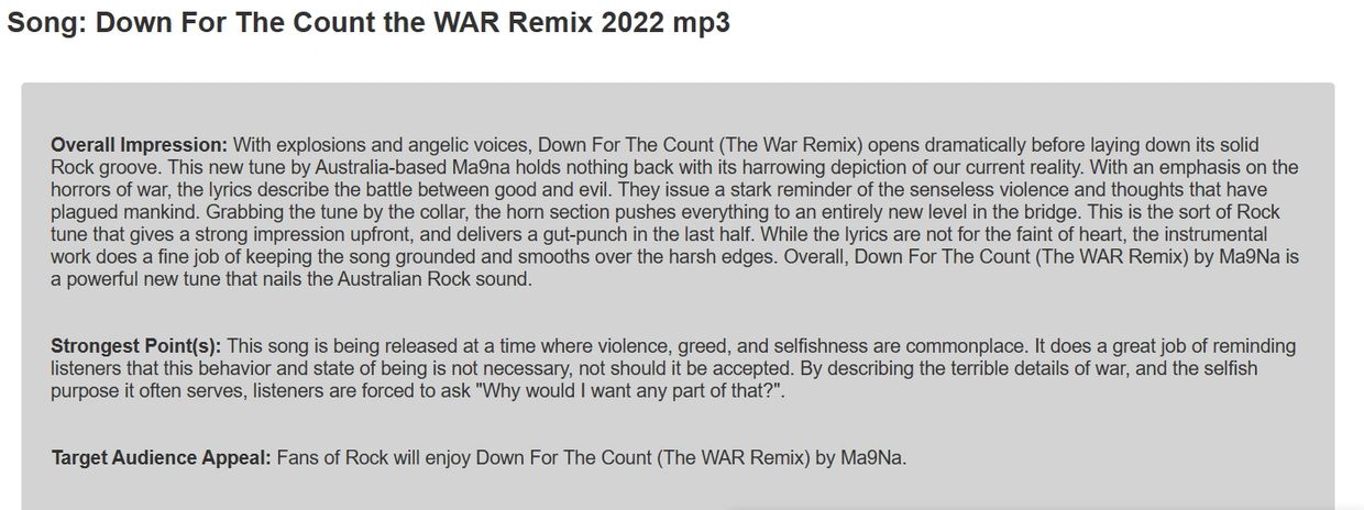 "This is an undeniably absorbing listening experience, and it's clear that a great deal of heart and effort has gone into the track. I found this to be a highly immersive listening experience and I have certainly had a good time with this track. Great work!"